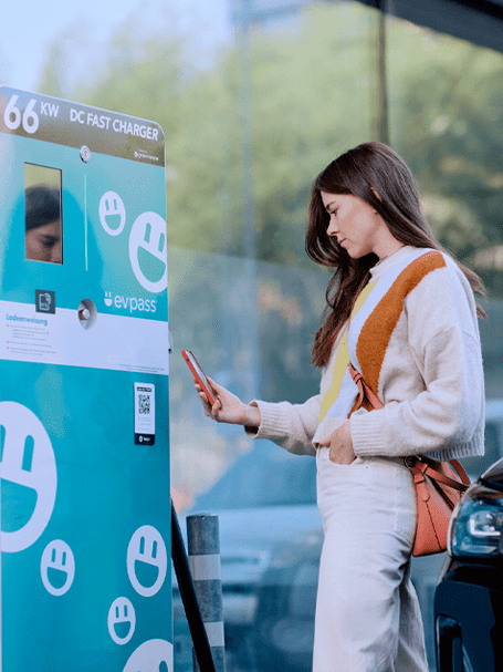 Une jeune femme paie son plein facilement et rapidement avec TWINT en scannant le code QR de la pompe à essence