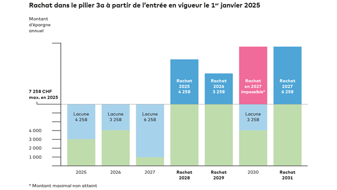 La nouvelle loi est entrée en vigueur le 1er janvier 2025. Un versement rétroactif est possible au plus tôt en 2026 pour combler une lacune de cotisations pour l’année 2025 (jusqu’à un maximum de 7258 CHF pour l’ensemble), à condition que le montant maximal ordinaire pour 2026 ait déjà été versé. Pour l’année en cours (2026), les montants maximums suivants s’appliquent: