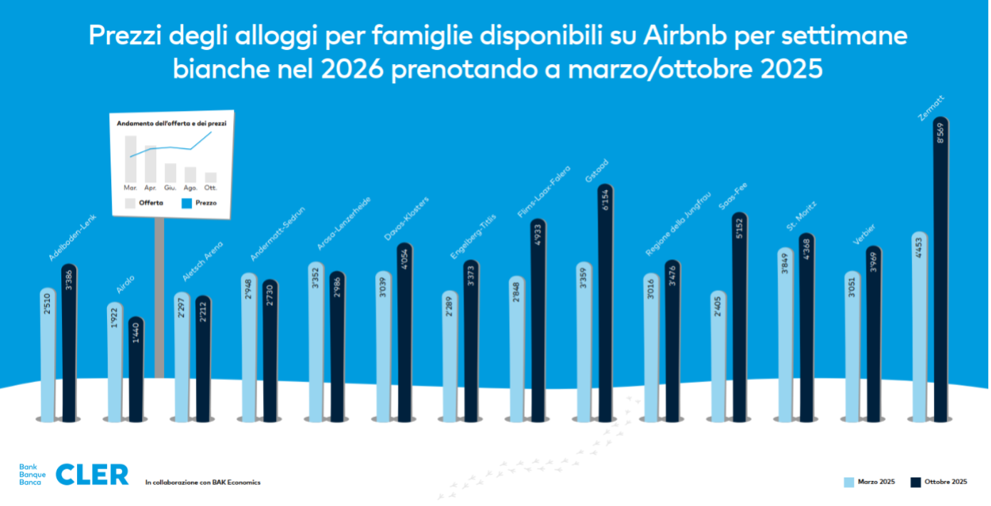 Anche quest’inverno la settimana bianca in Svizzera è molto popolare. La domanda di alloggi è quindi elevata e influisce notevolmente sull’andamento dei prezzi. Dal nuovo studio della Banca Cler e di BAK Economics emerge chiaramente che chi desidera organizzare le vacanze sulla neve a febbraio 2026 ma non ha ancora prenotato dovrà pagare molto di più rispetto a chi si è mosso con anticipo. Soprattutto le famiglie e quanti sono attenti ai prezzi traggono vantaggio da una pianificazione anticipata, poiché l’offerta diminuisce rapidamente nel corso dell’anno e di conseguenza in molte località i prezzi aumentano. «Il momento della prenotazione incide più che mai sul costo della settimana bianca», afferma Samuel Meyer, CEO della Banca Cler. «Chi prenota in primavera non solo ha una scelta più ampia, ma nella maggior parte delle destinazioni paga anche molto meno rispetto a chi prenota a ottobre». Le coppie beneficiano di un leggero calo dei prezzi degli hotel e nel 2026 pagheranno meno rispetto all’anno precedente. Lo studio, pubblicato per la prima volta nel 2019, confronta diverse voci di costo relative alla settimana bianca con i dati dell’anno precedente e prende in considerazione 14 località sciistiche in tutta la Svizzera.