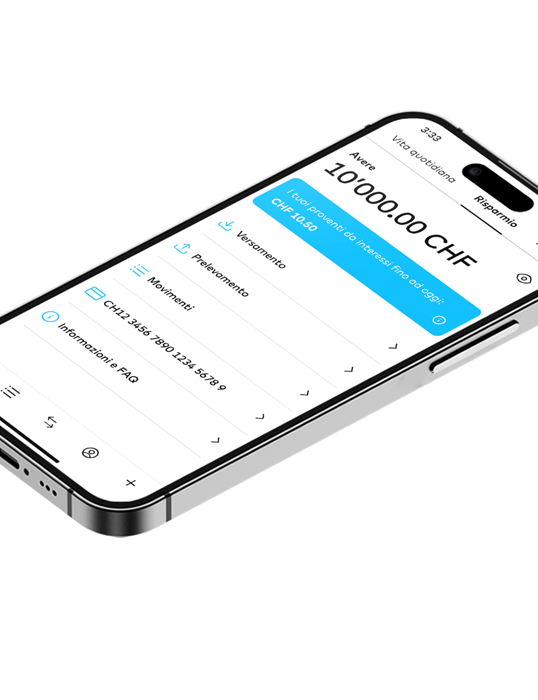 L'apertura del conto avviene completamente online attraverso il tuo smartphone e richiede solo qualche minuto. A tale proposito, ti preghiamo di tenere a portata di mano il tuo passaporto o la tua carta d'identità (per le persone di nazionalità straniera anche il libretto per stranieri oppure il certificato di residenza).