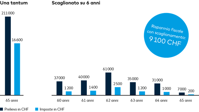 All’età di 65 anni, il signor Müller ha tre conti di previdenza e due conti di libero passaggio, oltre a una soluzione assicurativa in scadenza nel 2028. Sceglie di riscuotere gli importi previdenziali nell’arco di sei anni e paga così un’imposta sulle prestazioni in capitale inferiore a quella dovuta nel caso di un versamento unico, per un risparmio di 9100 franchi.