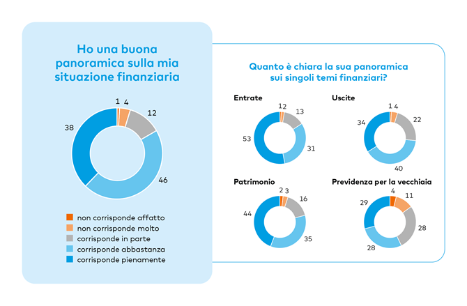 Per quanto riguarda la vita quotidiana, la maggior parte degli intervistati dichiara di avere una buona organizzazione dal punto di vista finanziario. L'84% dichiara di avere una buona panoramica sulle proprie finanze. Tuttavia, quando si tratta di previdenza per la vecchiaia emerge un punto debole: solo il 57% conosce esattamente la propria situazione in termini di previdenza per la vecchiaia.