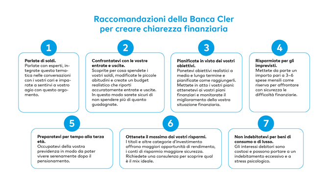 Per molti, le finanze sono un peso emotivo: il 41% degli intervistati manifesta preoccupazione quando pensa alla propria situazione finanziaria, mentre il 35% ritiene stressanti le conversazioni sul denaro. Particolarmente colpiti sono i giovani e le economie domestiche con bambini. Le persone senza figli riferiscono più spesso di avere chiarezza finanziaria rispetto a quelle con figli. Allo stesso tempo, lo studio mostra un'evidente correlazione tra chiarezza, benessere finanziario e benessere generale: il 98% delle persone soddisfatte dal punto di vista finanziario ha le proprie finanze ben sotto controllo, mentre tra le persone finanziariamente stressate la percentuale si ferma al 68%. Le persone con un maggiore benessere finanziario riferiscono anche una maggiore soddisfazione generale nella vita. Quando si parla di soldi, è più probabile che lo si faccia in famiglia: il 57% ne parla con i propri cari.