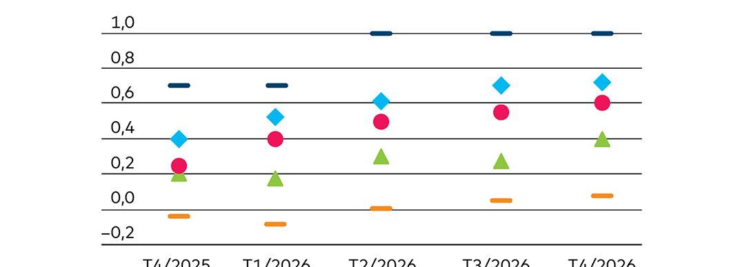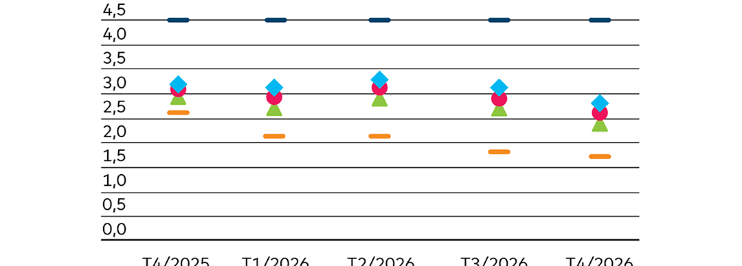 È interessante notare che, malgrado il generale indebolimento della dinamica congiunturale, secondo le previsioni disponibili su Bloomberg i tassi d’inflazione nel 2026 dovrebbero registrare un andamento differenziato. Nell’eurozona si prevede un rincaro nuovamente al di sotto della soglia del 2% e in Svizzera un valore inferiore all’1%. Negli Stati Uniti, invece, a causa dei dazi, si teme che il tasso d’inflazione possa salire oltre il 4% (cfr. fig. 1).