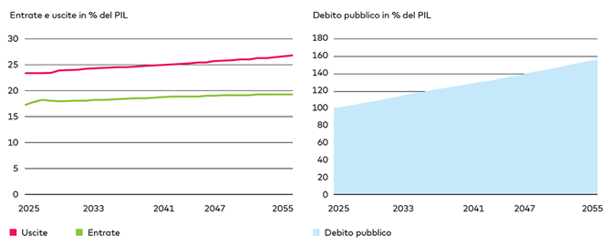 Non è una novità che l’oro, in tempi incerti, rappresenti un efficace strumento di diversificazione all’interno di un portafoglio. Attualmente sono molti i fattori che rivestono un ruolo importante: le questioni geopolitiche e geostrategiche aperte, i timori per la democrazia negli USA, i rischi di un aumento dei tassi d’inflazione statunitensi e le discussioni sul ruolo del dollaro USA come valuta di riferimento e di riserva mondiale. Un altro aspetto essenziale, per noi, è l’andamento del debito pubblico negli Stati Uniti. Attualmente il tasso d’indebitamento americano (debito pubblico in % del PIL) è leggermente superiore al 100%. Da tempo la spesa pubblica supera di gran lunga le entrate, e questa tendenza – nonostante i gettiti derivanti dai dazi – dovrebbe perdurare nei prossimi anni. Se non ci sarà una drastica inversione di rotta in ambito politico, il Congressional Budget Office prevede che il tasso d’indebitamento statunitense salirà a quasi il 160% entro il 2055 (cfr. fig. 2).