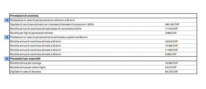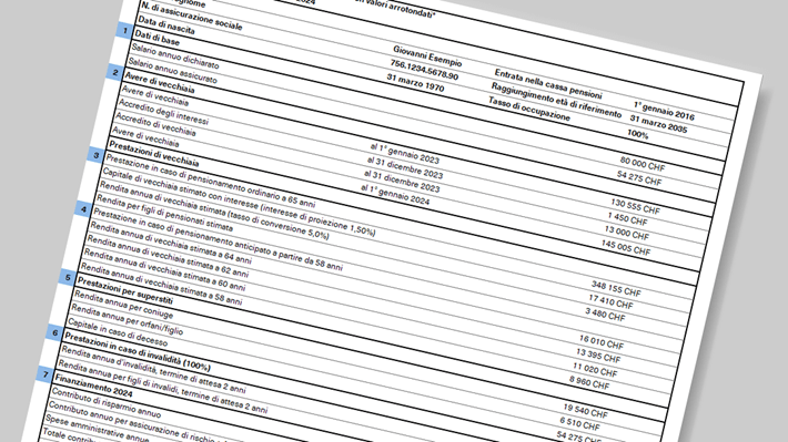 Si tratta del capitale di vecchiaia stimato che riceverete alla data del pensionamento ordinario. È un calcolo puramente indicativo, che la cassa pensioni effettua sulla base di un salario invariato, di un tasso d’interesse di proiezione e dell’aliquota di conversione attualmente in vigore. Non può essere quindi un valore preciso, poiché le condizioni per gli anni mancanti al pensionamento sono soggette a variazioni. Più la data del pensionamento si avvicina, più il certificato della cassa pensioni risulterà significativo.