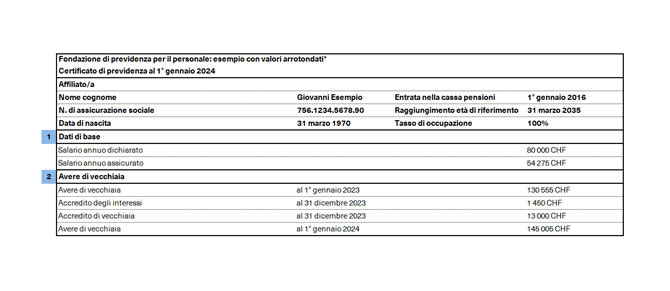 Questa sezione indica l’avere della cassa pensioni accumulato finora. È composto dai contributi versati da voi personalmente e dal vostro datore di lavoro. Se avete fatto trasferire all’attuale cassa pensioni l’avere maturato nel corso di precedenti rapporti di lavoro oppure avete effettuato riscatti volontari nella cassa pensioni, queste somme sono comprese nell’importo complessivo. Il tasso d’interesse minimo previsto dalla legge viene determinato dal Consiglio federale e varia di anno in anno. Nel 2024 ammonta all’1,25% e si applica alla parte obbligatoria dell’avere. Gli averi eccedenti possono essere rimunerati a un tasso inferiore. Se nel corso dell’anno la cassa pensioni realizza una buona performance e si trova in una situazione di stabilità finanziaria, può concedere un interesse più elevato.