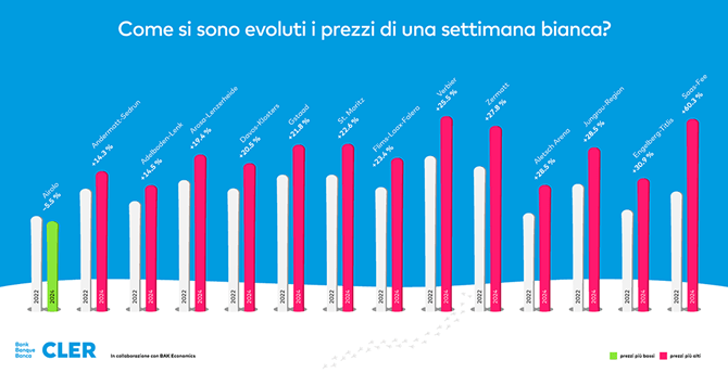 Il turismo sulla neve in Svizzera implica l’accesso a tutta una serie di infrastrutture e servizi: appartamento di vacanza o sistemazione in hotel, skipass per tutta la famiglia, noleggio di sci e snowboard, ristoro sulle piste, scuola di sci e così via. Divertirsi in montagna, pertanto, comporta parecchie spese. A novembre 2023 la Banca Cler, che dal 2019 collabora con BAK Economics per analizzare i prezzi delle settimane bianche nel nostro paese, ha cercato una risposta alle seguenti domande: quanto costerà una settimana bianca in Svizzera nella stagione 2024 (10–17 febbraio 2024)? Come sono cambiati i prezzi rispetto all’inverno del 2022, il primo dopo la pandemia da coronavirus? I dati raccolti in 14 località sciistiche per una settimana bianca (skipass di 8 giorni, soggiorno di 7 notti) mostrano l’evoluzione dei costi per diversi segmenti di clientela (famiglie con due figli, coppie di coniugi e studenti) in vista della nuova stagione. Ulteriori dettagli sull’analisi sono riportati in fondo al presente comunicato stampa.