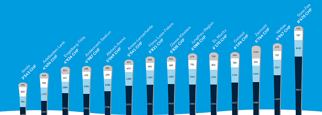 In testa alla classifica delle stazioni sciistiche più care della Svizzera ci sono Verbier, Saas-Fee e Zermatt. Il primato assoluto, con un costo di 8470 CHF per la settimana bianca di una famiglia, va a Saas-Fee; a Verbier e Zermatt, invece, la spesa ammonta a circa 7000 CHF (Verbier 6967 CHF, Zermatt 6764 CHF). Per le coppie di coniugi è Verbier la località più cara (6429 CHF), seguita da Zermatt (5684 CHF) e Gstaad (5225 CHF). Per gli studenti, invece, la settimana bianca costa di più a Zermatt (1898 CHF); al secondo posto troviamo Saas-Fee (1798 CHF) e al terzo la regione Jungfrau (1718 CHF).