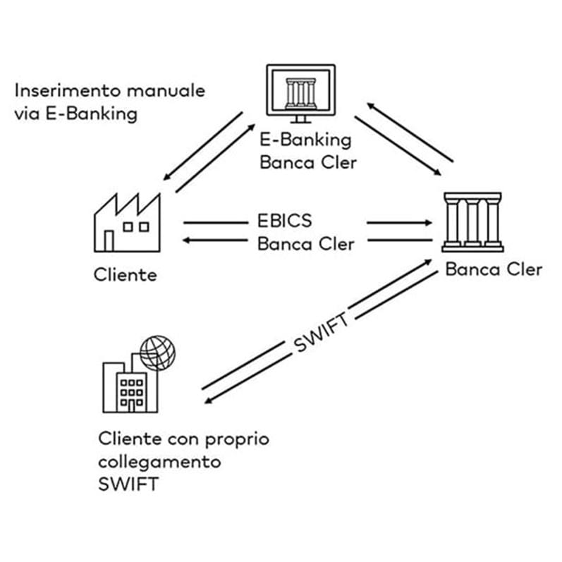 Processi economici efficienti sono fattori di successo fondamentali per un imprenditore. Le richieste qualitative e quantitative del mercato richiedono un alto grado di efficienza e di consapevolezza delle risorse per la fornitura di servizi dell'attività core. Affinché ciò non si limiti al traffico dei pagamenti, avete a disposizione moderne interfacce digitali per il vostro scambio quotidiano di messaggi e documenti. Avvaletevi quindi dell'opportunità di gestire i vostri pagamenti in entrata e in uscita nel modo più automatizzato possibile. Vi forniamo volentieri una consulenza.