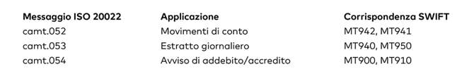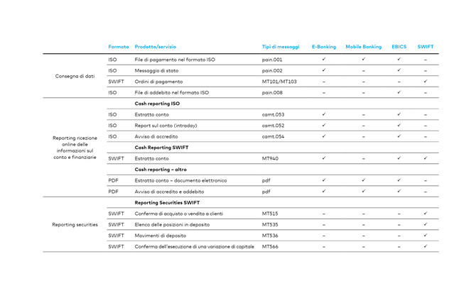 I messaggi SWIFT attuali, come MT940, MT571, ecc., rimarranno in vigore e non verranno sostituiti. I dati disponibili nell'E-Banking possono essere richiesti/scaricati sia come messaggi SWIFT sia come messaggio camt.
