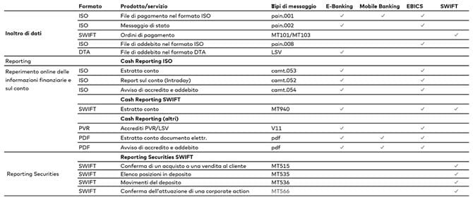 I messaggi SWIFT attuali, come MT940, MT571, ecc., rimarranno in vigore e non verranno sostituiti. I dati disponibili nell'E-Banking possono essere richiesti/scaricati sia come messaggi SWIFT sia come messaggio camt.