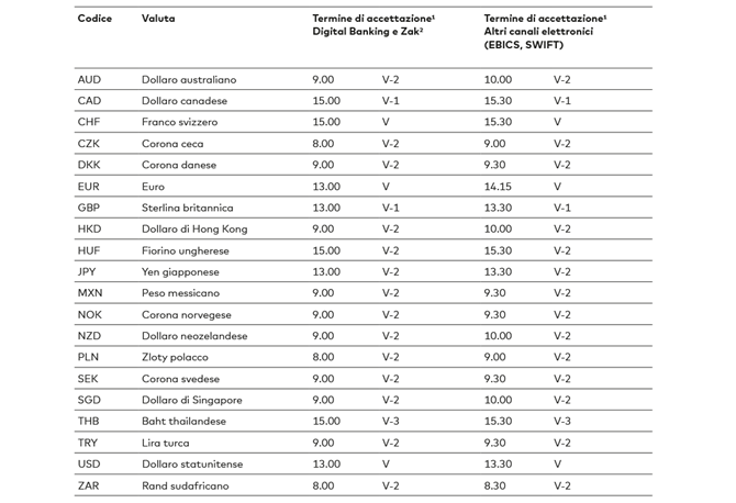 I termini di accettazione si riferiscono all'ultimo orario di consegna possibile di un ordine nella rispettiva valuta, affinché al momento dell'esecuzione dell'ordine la data di valuta desiderata possa essere garantita. L'esecuzione tempestiva implica, tra le altre cose, istruzioni di pagamento corrette e complete e fondi disponibili sul conto da addebitare.