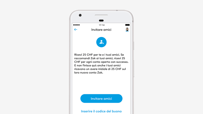 Non appena uno dei tuoi amici apre con successo il conto Zak e registra il tuo codice di raccomandazione nell'app, tu e il tuo amico riceverete direttamente sul vostro conto 25 CHF a testa.