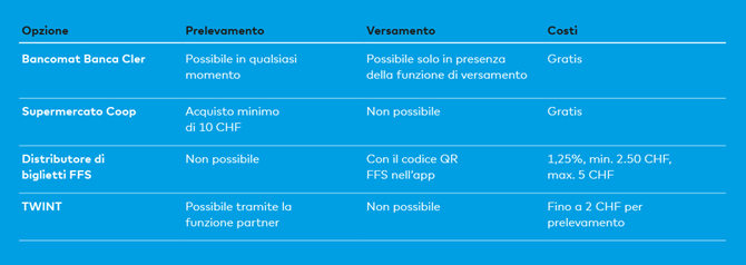 Puoi versare fino a 600 CHF alla volta. La commissione è pari all'1,25% dell'importo versato; almeno 2.50 CHF, al massimo 5 CHF.