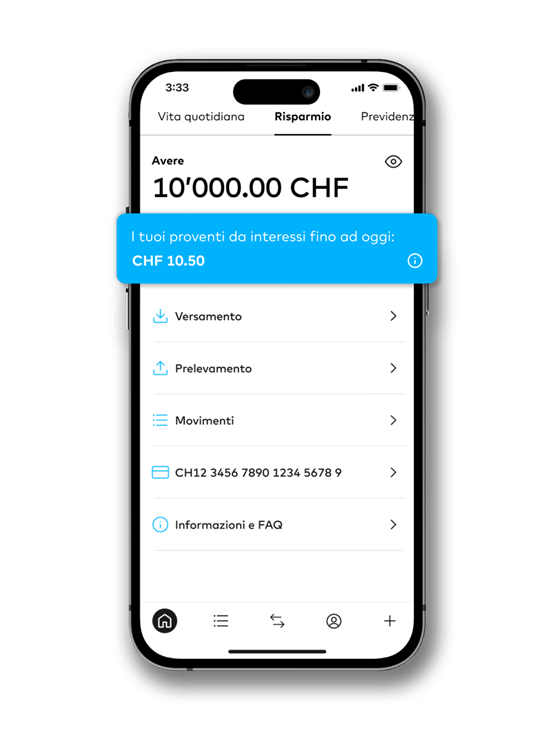 Sarà capitato di sicuro anche a te di dover sostenere spese impreviste per una riparazione dell'auto, una visita dal medico o un nuovo smartphone perché quello precedente si è rotto. Risparmia per gli imprevisti, ma anche per le spese pianificate, come le vacanze o una formazione, e tieniti aperta la possibilità di utilizzare il denaro nel breve periodo. Inoltre, con la garanzia dei depositi il tuo capitale è tutelato fino all’importo massimo di 100 000 CHF.