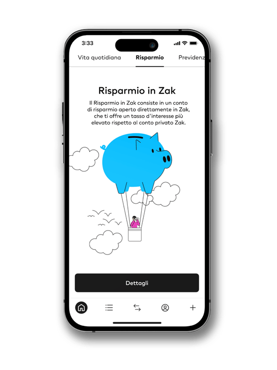 Il Risparmio in Zak consiste in un conto di risparmio aperto direttamente in Zak, che ti offre un tasso d'interesse più elevato rispetto al conto privato Zak.