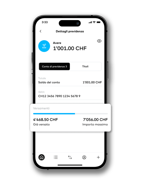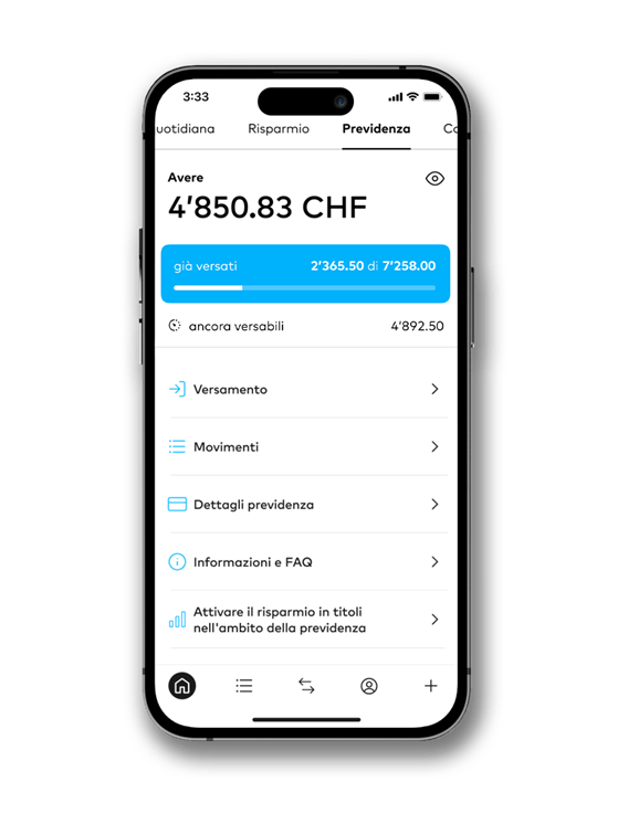 ** Se selezioni il prodotto «Risparmio in titoli nell'ambito della previdenza» dobbiamo definire il tuo profilo di rischio ponendoti qualche domanda. Ciò significa che analizziamo la tua propensione al rischio e le tue aspettative di rendimento. Dopodiché, su tale base, scegli la strategia d'investimento e l'importo di base. Tutti i versamenti sul tuo conto di previdenza 3 che eccedono l'importo di base verranno quindi investiti in titoli.