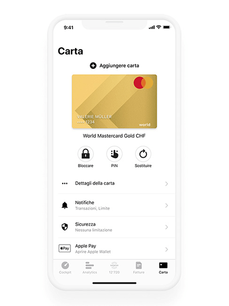 Gestite tutte le vostre carte in modo sicuro e semplice in un'unica app – carte di credito, carte di debito o carte prepagate, non importa. L'app one di Viseca lo rende possibile. In questo modo avete sempre le vostre carte sotto controllo, pagate online in maniera sicura e analizzate le vostre spese. Inoltre potete utilizzare numerosi servizi, come bloccare carte o ordinare carte sostitutive.