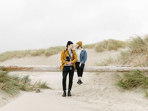 Immagine simbolica per una coppia in viaggio: giovane coppia con macchina fotografica che si gode il momento insieme, seduta su un tronco d'albero in una spiaggia